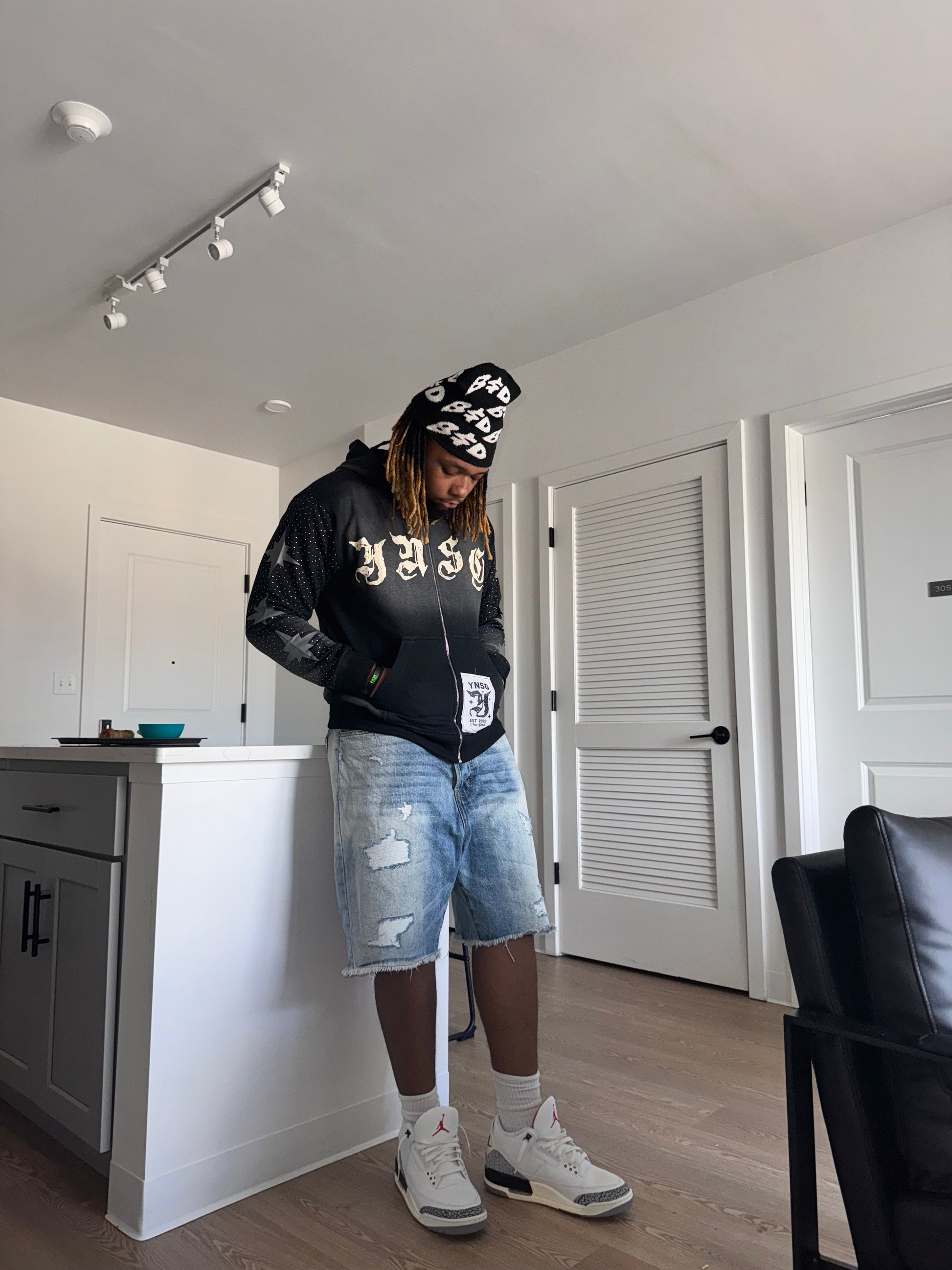 Hoodie season is here! So why not look stylish while staying warm? Our YNSG zip up hoodie is perfect for this fall/winter. The acid wash design, with the gray and eggshell logos, are the great mix for the cold vibes. Oh wait, did we say RHINESTONES?